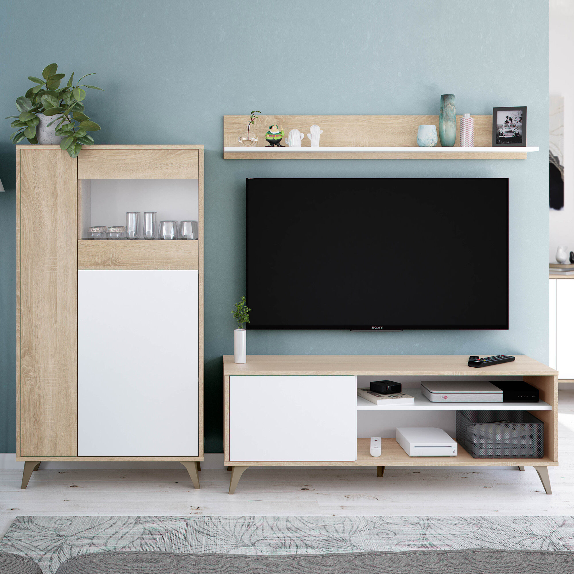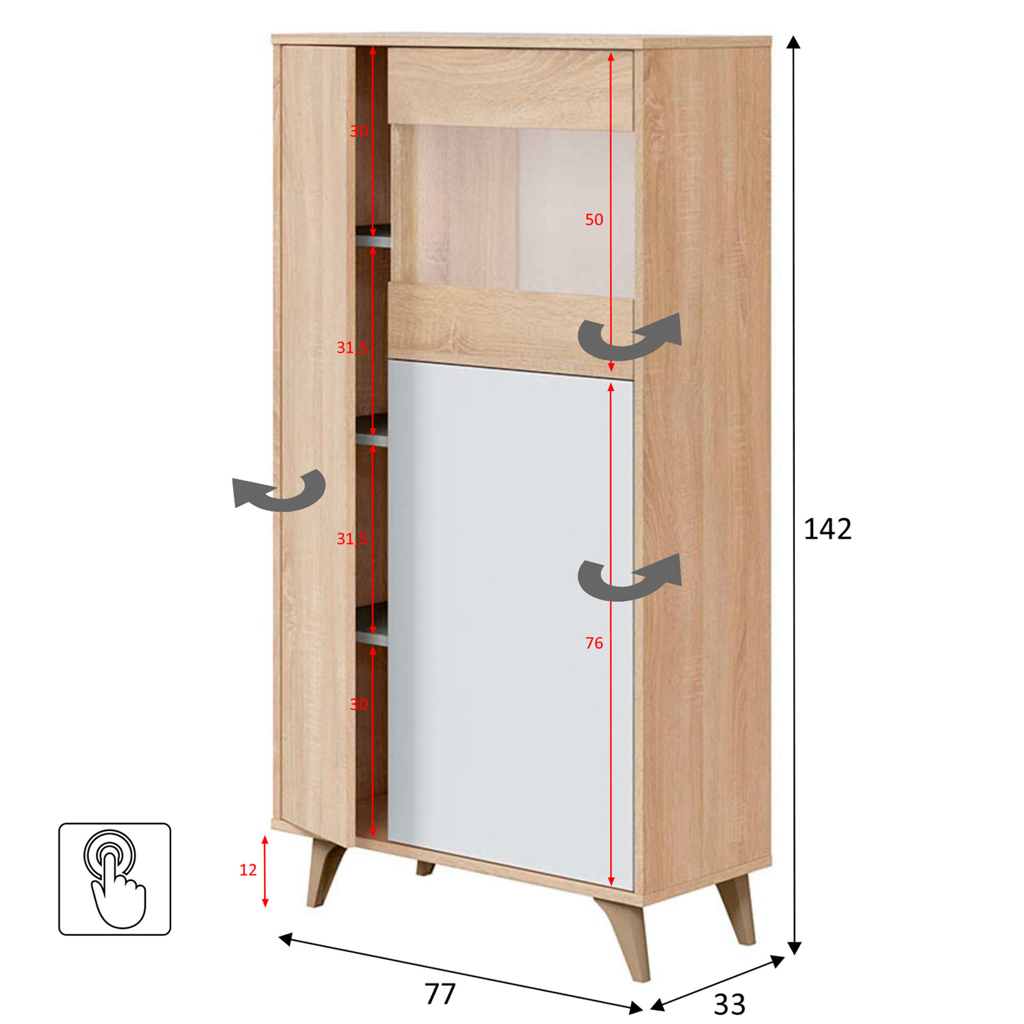 - Vitrina de 3 puertas fabricada con melamina de alta calidad y de larga durabilidad; Producto Certificado por la PEFC (Asociación Española para la Sostenibilidad Forestal), de color Roble/Blanco, dejando entrar el estilo moderno por excelencia a tu hogar.