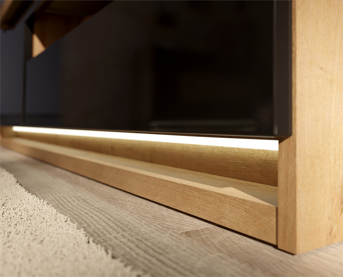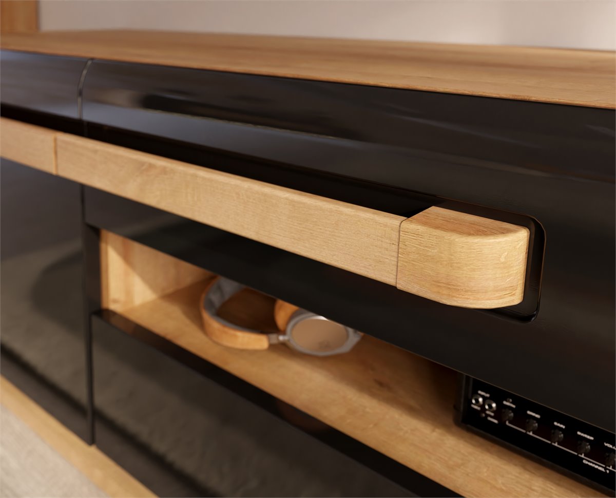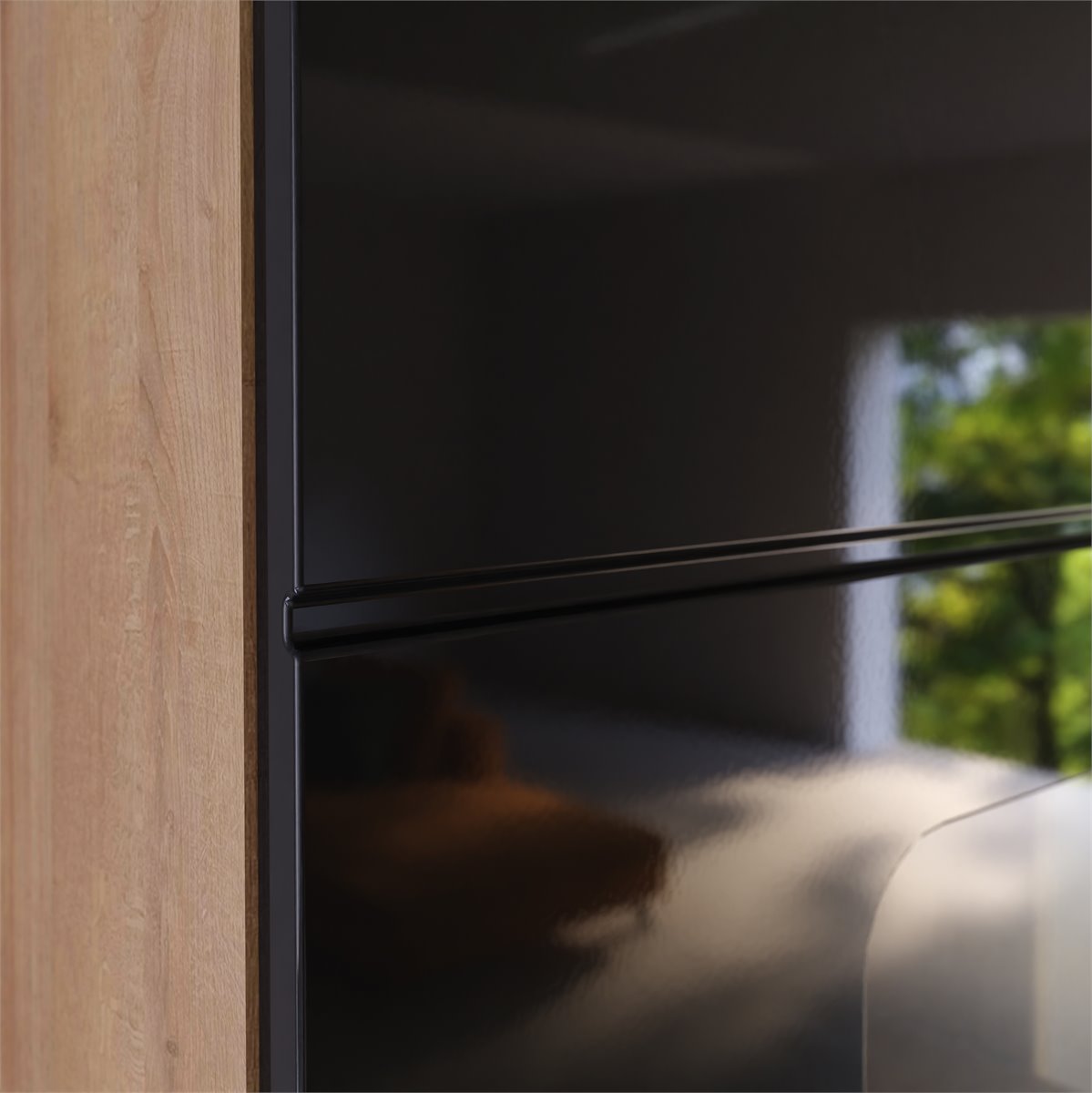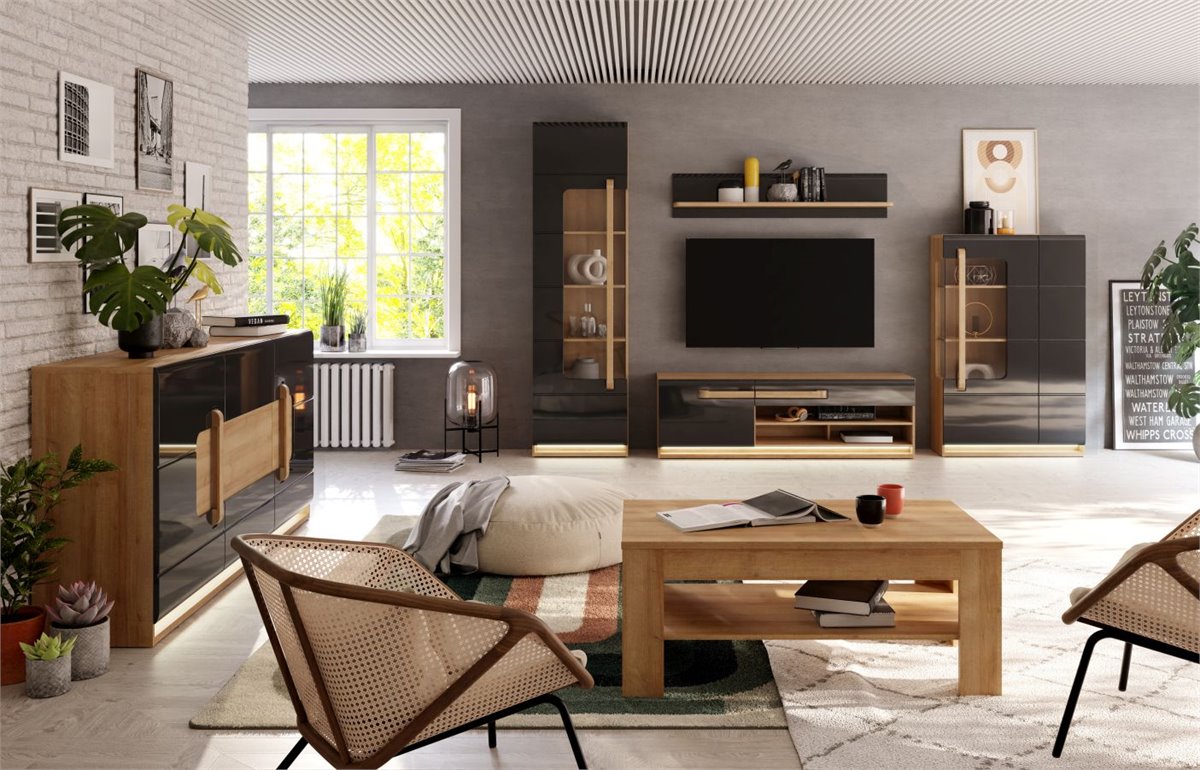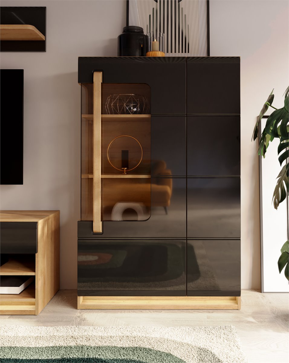 Sé la envidia de todas tus visitas con la vitrina MONTREAL. Con un espectacular diseño vanguardista, en negro brillante y roble, esta vitrina es idónea para lucir en ella tus objetos más preciados. Sus iluminadores Led con destellos verdes en el zócalo, harán de esta vitrina el centro de todas las miradas. El sistema de cierre soft garantiza que todo lo que guardes en ella se mantendrá a salvo de portazos involuntarios. Lo que guardes dentro formará parte de la decoración de tu salón gracias a esta vitrina.