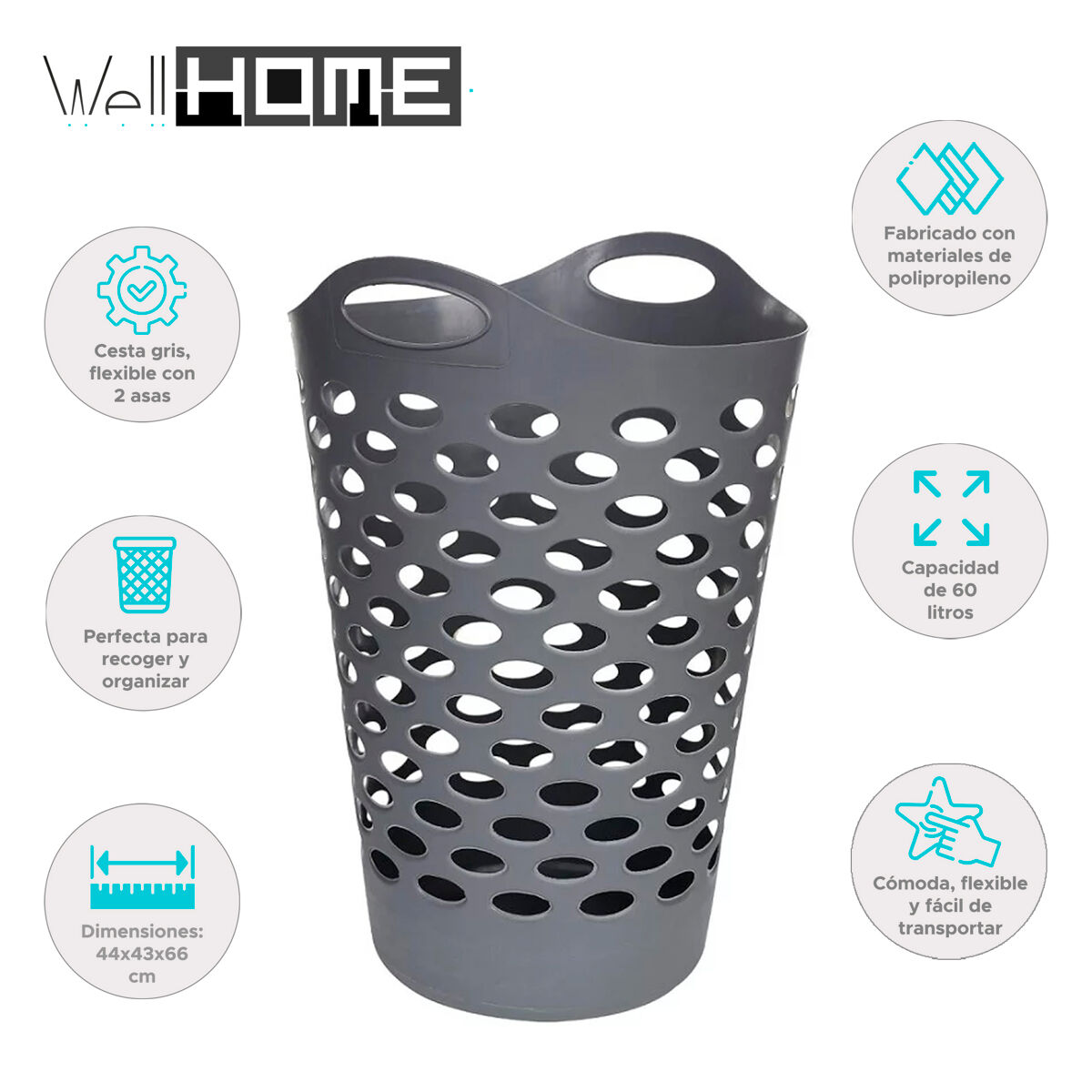 Fabricada en polipropileno, con unas dimensiones de 44x43x66 cm y capacidad de 60 L.