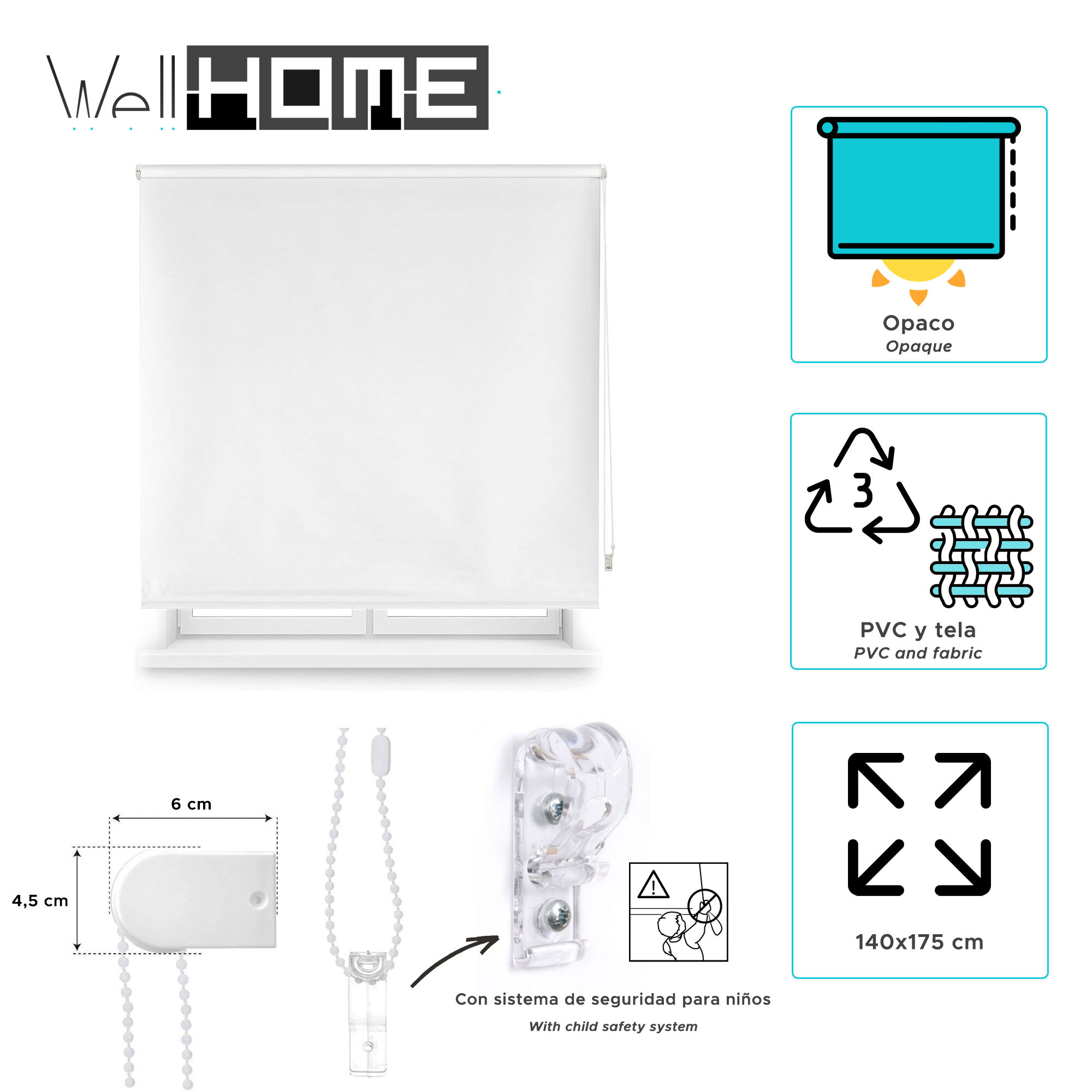 Mecanismo y cadena de PVC en color blanco, regulación mediante mecanismo de cadena con seguridad infantil. Cuenta con un tubo de 25mm.