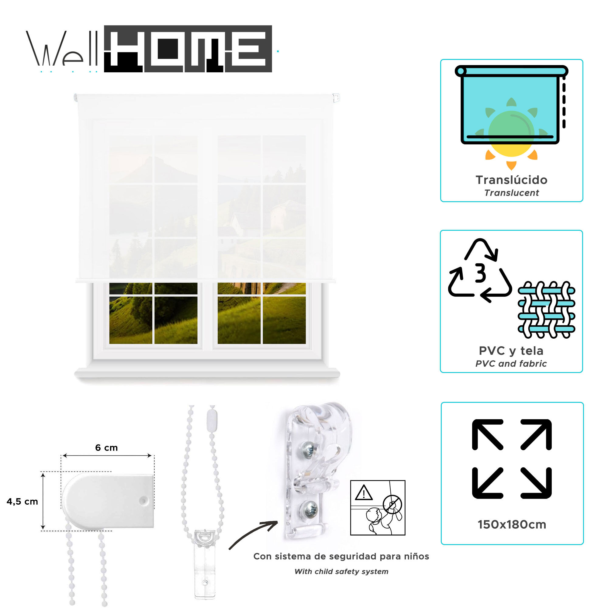 Mecanismo y cadena de PVC en color blanco, regulación mediante mecanismo de cadena con seguridad infantil. Cuenta con un tubo de 25mm.
