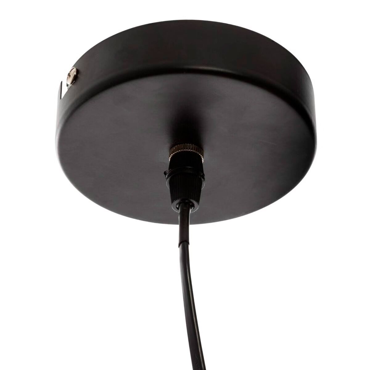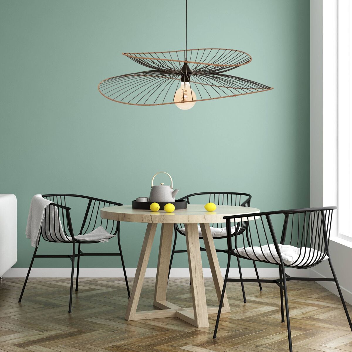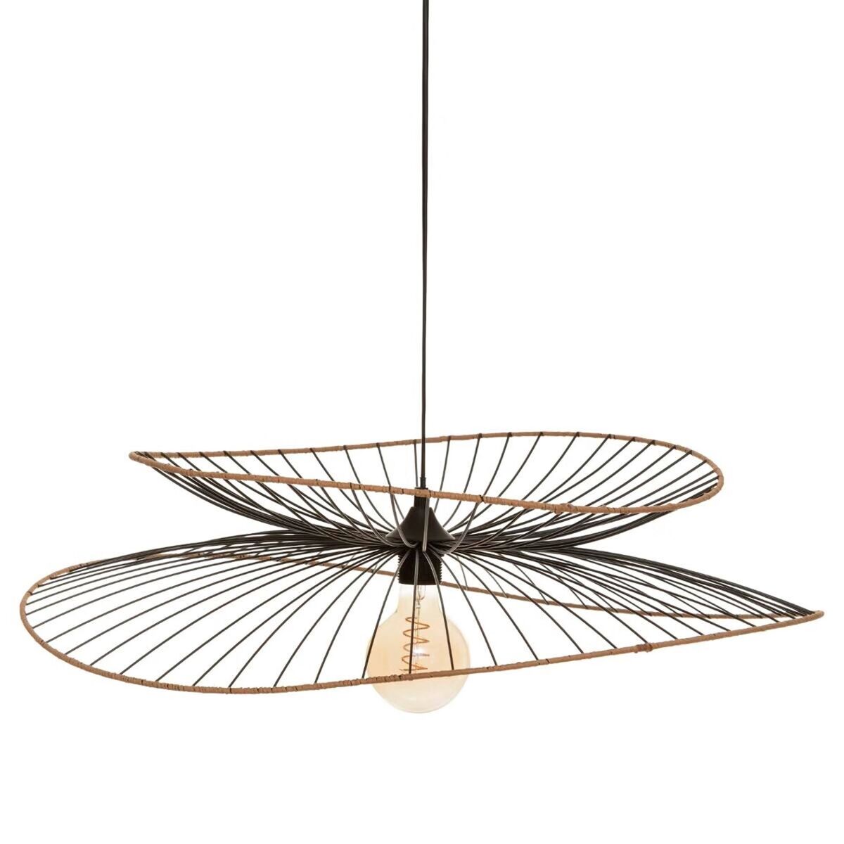 Esta lámpara de suspensión en metal negro Ø69,5 es un diseño de tendencia que destaca por su forma de doble pantalla de hierro y sus contornos cubiertos con papel efecto madera que aportan calidez al ambiente.