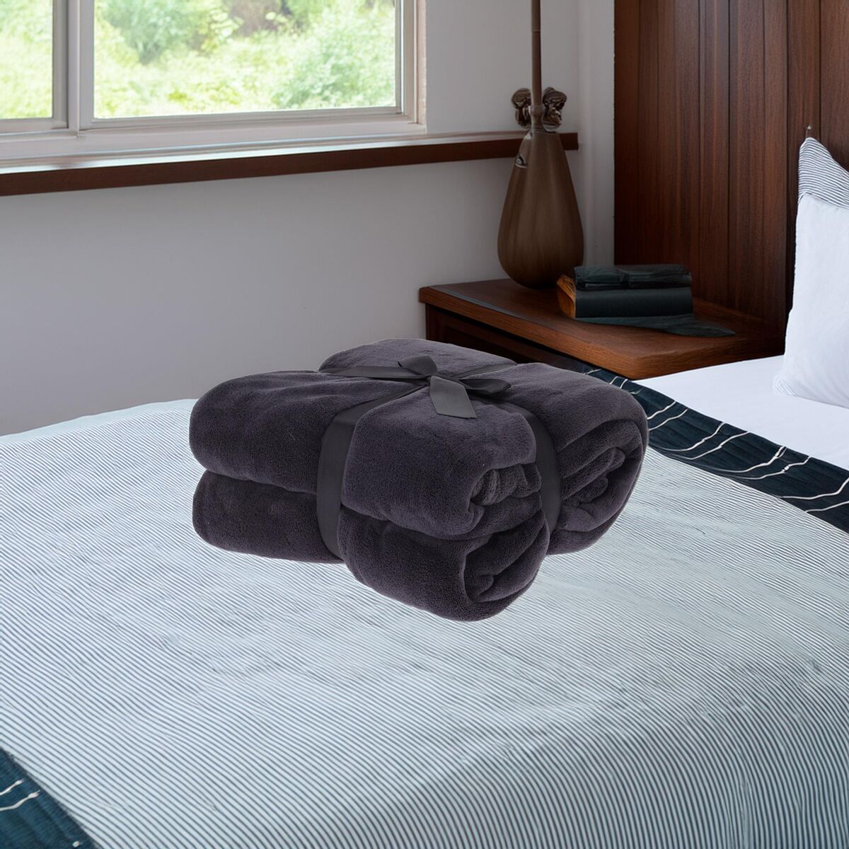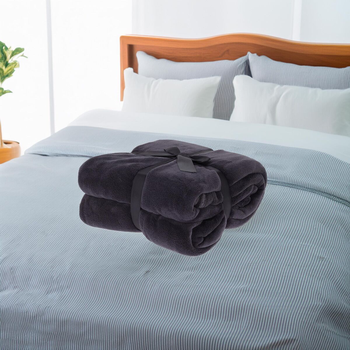 Confeccionada en 100% poliéster y un grosor de 250 GSM, esta manta en elegante color antracita es perfecta para todas las estaciones.