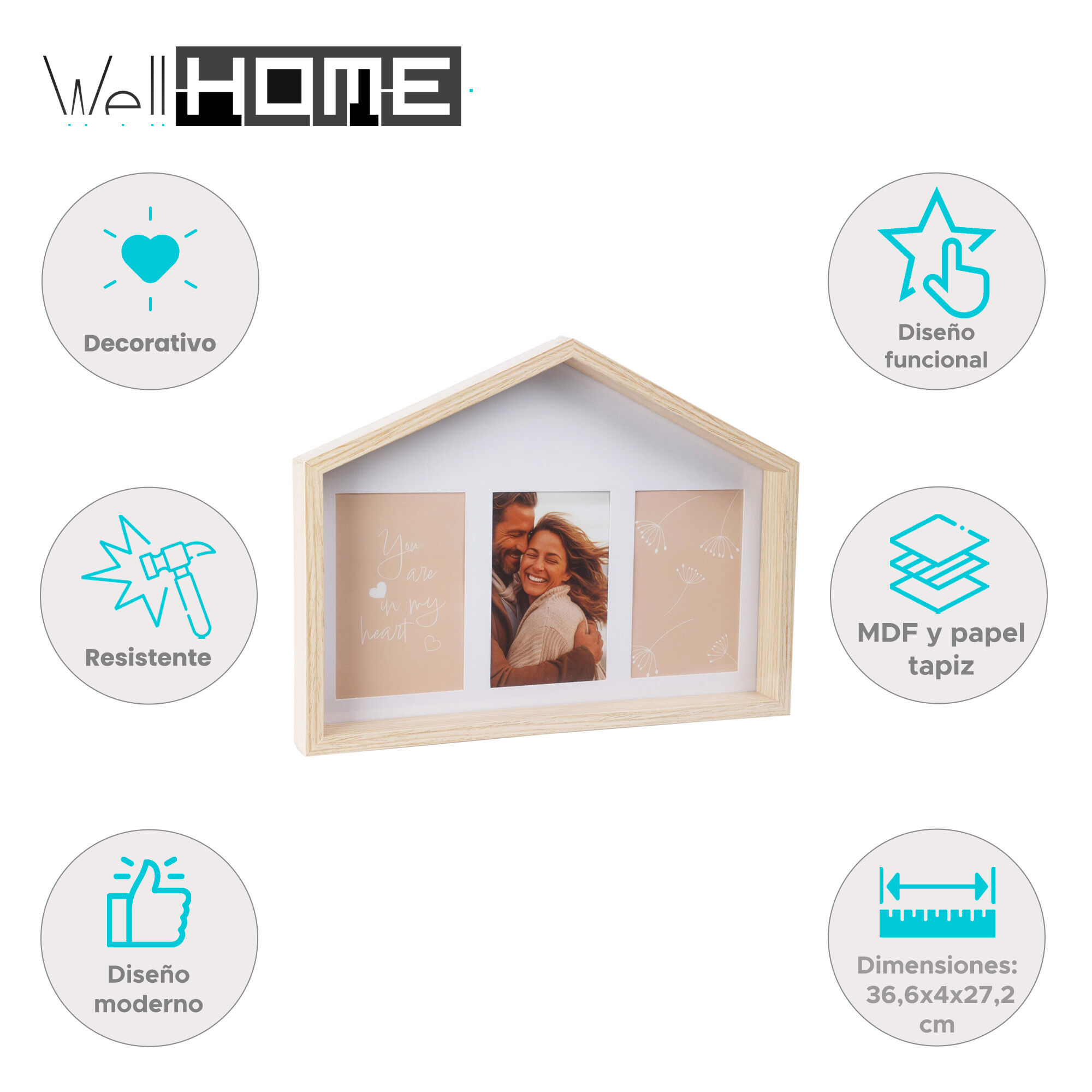 Dale un toque único a tus fotografías con este original marco de fotos en forma de casa, fabricado en MDF y con papel tapiz de color.