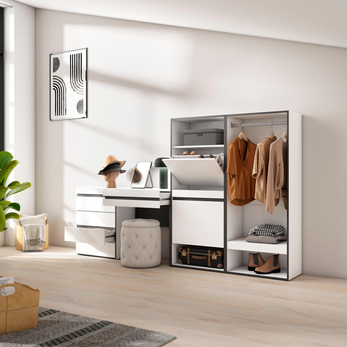 Módulo vestidor abierto con estantes y barra para colgar. Optimiza el espacio con este armario sin puertas que ofrece un práctico y funcional espacio de almacenamiento para su ropa, zapatos y complementos. Elegante y de estilo moderno. Medidas: 60 x 35 x 145 cm (Largo x Ancho x Alto). Color blanco y negro con veteado de madera de tacto poroso.