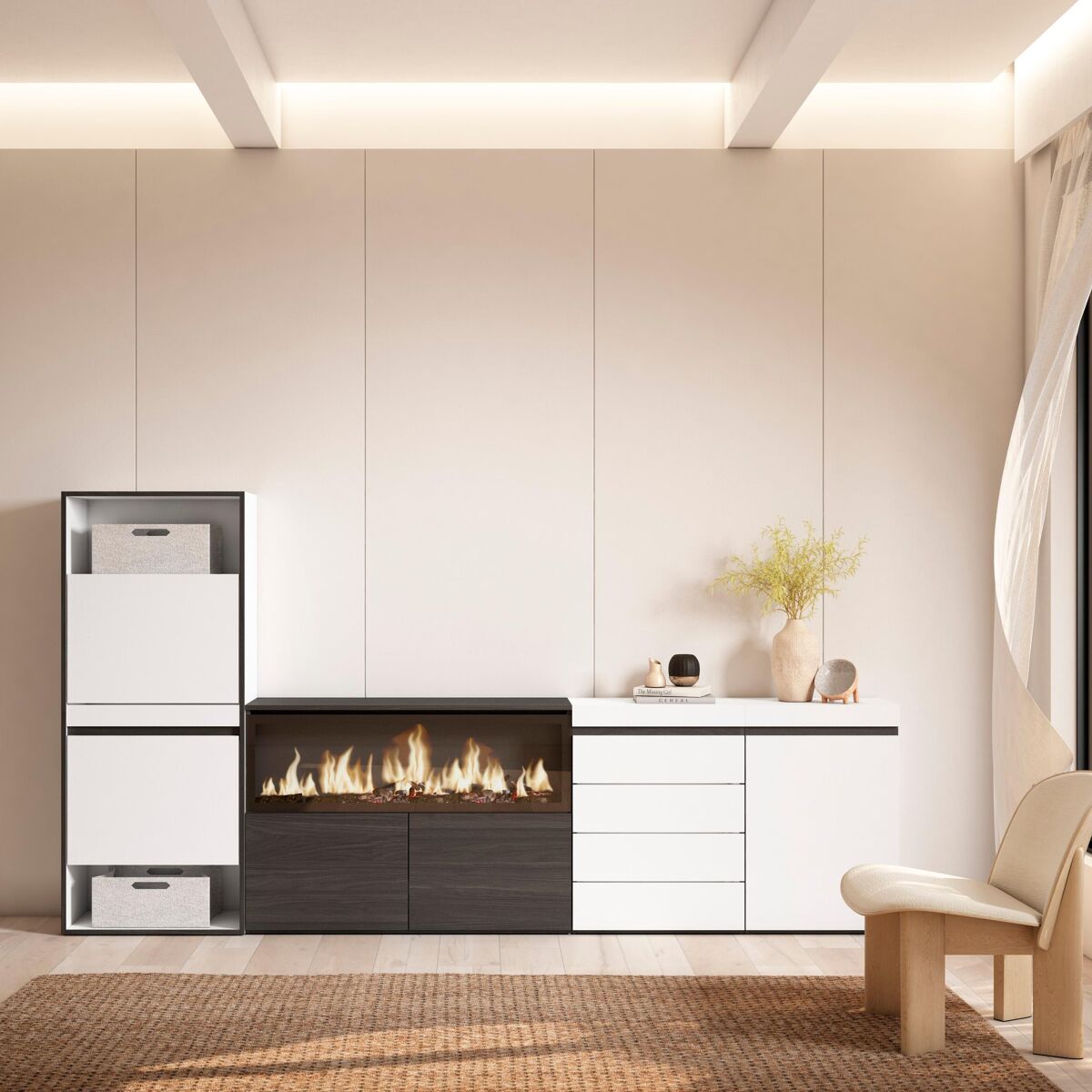 Módulo con puerta y estante interior divisorio. Medidas del Módulo: 51cm. De Ancho, 75cm. De Alto, 35cm. de Profundidad. Color blanco sólido mate y negro con veteado de madera de tacto poroso de alta calidad.